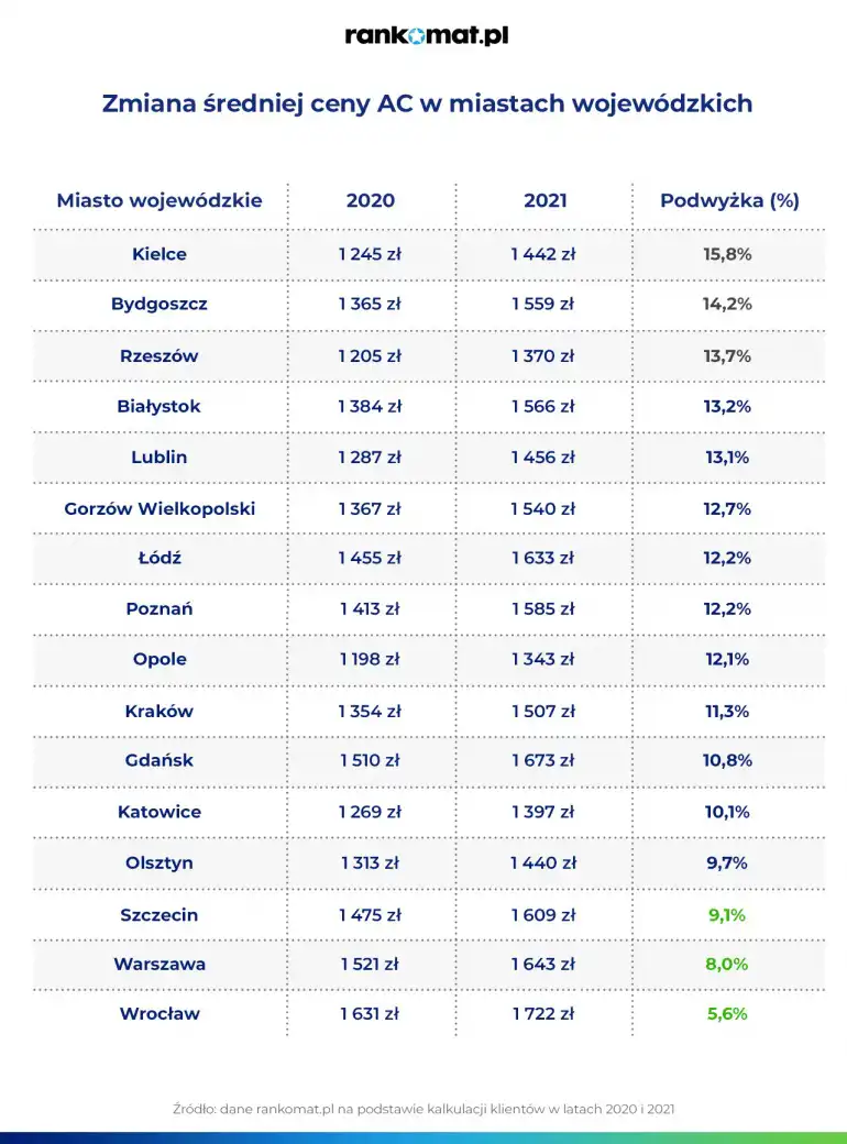 W ubiegłym roku średnie ceny ubezpieczenia OC AC wzrosły w każdym mieście wojewódzkim. Największe podwyżki w stosunku do 2020 r. dotyczyły Kielc (15,8%), Bydgoszczy (14,2%) oraz Rzeszowa (13,7%), a najmniejsze Wrocławia (5,6%) i Warszawy (8%). Jednocześnie jednak, w stolicach województw, w których doszło do najmniejszych wzrostów cen, kierowcy płacili jedne z najwyższych stawek za ubezpieczenie samochodu.