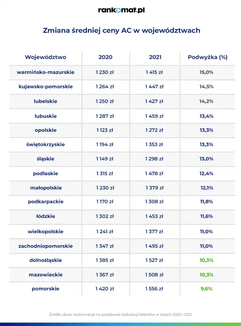 Eksperci rankomat.pl przeanalizowali, o ile wzrosły ceny pakietów OC i AC w 2021 roku w porównaniu do roku ubiegłego. Analiza składek obejmuje wszystkie województwa, największe miasta oraz TOP 10 najczęściej ubezpieczanych marek.