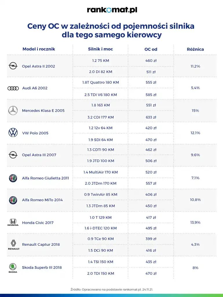 Eksperci rankomat.pl sprawdzili na przykładzie 10 modeli, jak zmienia się cena OC samochodu w zależności od pojemności silnika. Pod uwagę wzięto ten sam model z identycznego rocznika w dwóch różnych konfiguracjach: z mniejszym silnikiem i z większą (często wolnossącą) jednostką. W efekcie porównano pojazdy o tej samej lub podobnej mocy. Składkę liczono dla tego samego hipotetycznego żonatego kierowcy z jednym dzieckiem w wieku 10 lat, zamieszkałego w Łodzi (rocznik urodzenia 1986), posiadającego prawo jazdy kat. B od 2006 r. Jego samochód ma przebieg 200 tys. km, a średni roczny wynosi do 12,5 tysięcy. Nigdy nie miał szkody, a samochody ubezpiecza od 10 lat i parkuje je na ulicy.