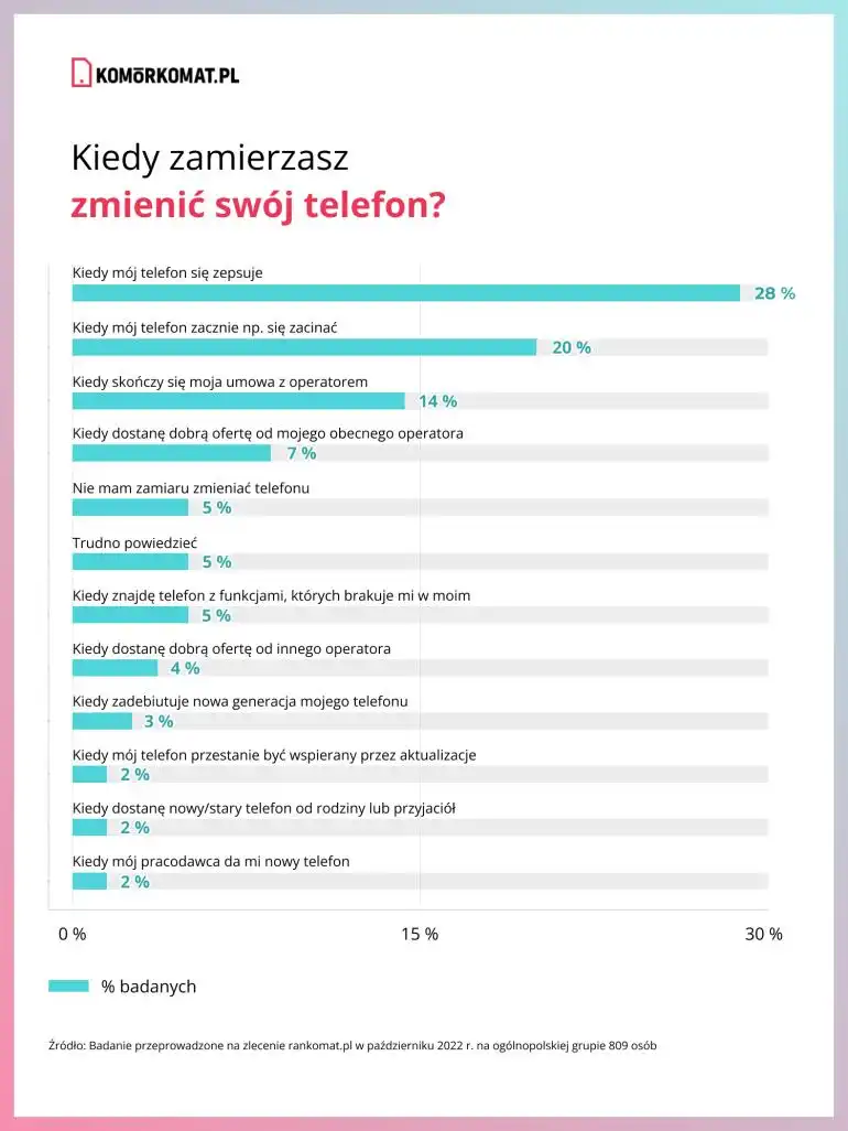 Kolejne szczegółowe badania przeprowadzone w październiku 2022 przez rankomat.pl wskazują na jeszcze mniejszą chęć zmiany telefonu. Jedynie 14% ankietowanych stwierdza, że dokona wymiany urządzenia po zakończeniu dotychczasowej umowy, a kolejnych 7 i 4% - kiedy zostanie zaproponowana atrakcyjna oferta odpowiednio przez obecnego i innego operatora. Niewielki odsetek (3%) wskazuje także na zmianę dotychczasowego telefonu, gdy pojawi się jego nowa generacja, co zazwyczaj ma miejsce około roku po premierze wcześniejszego modelu.