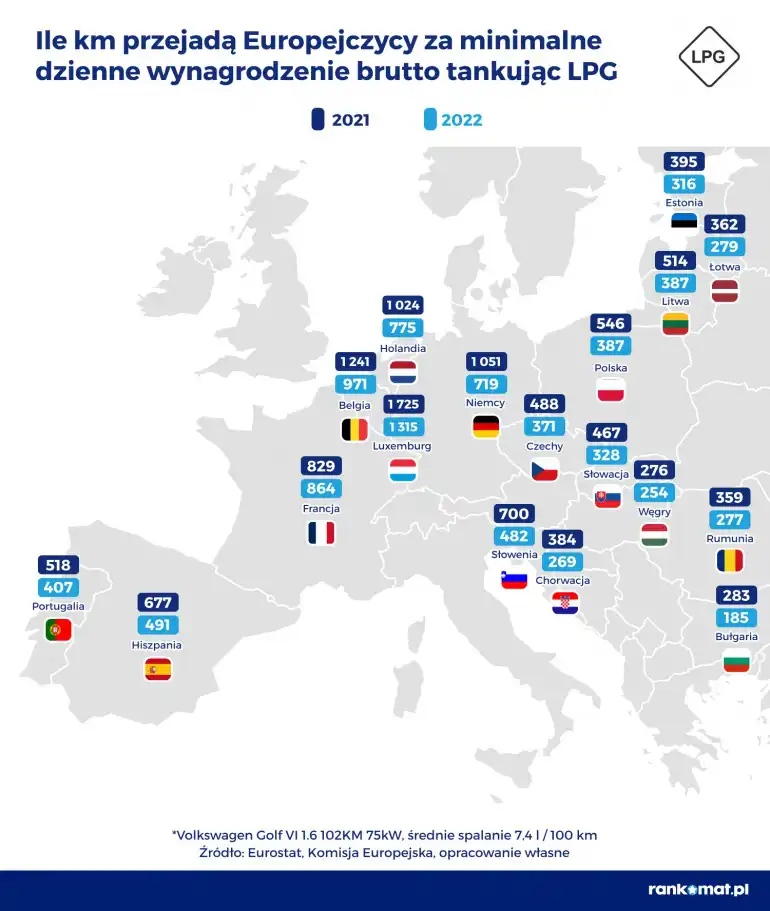 Największe odległości w 2022 roku mogą przejechać właściciele pojazdów napędzanych LPG. Mieszkańcy najbogatszego Luksemburga przejadą za równowartość swoich dziennych zarobków brutto aż 1315 km, choć i tak będzie to dystans krótszy o 410 km niż w 2021 r.
