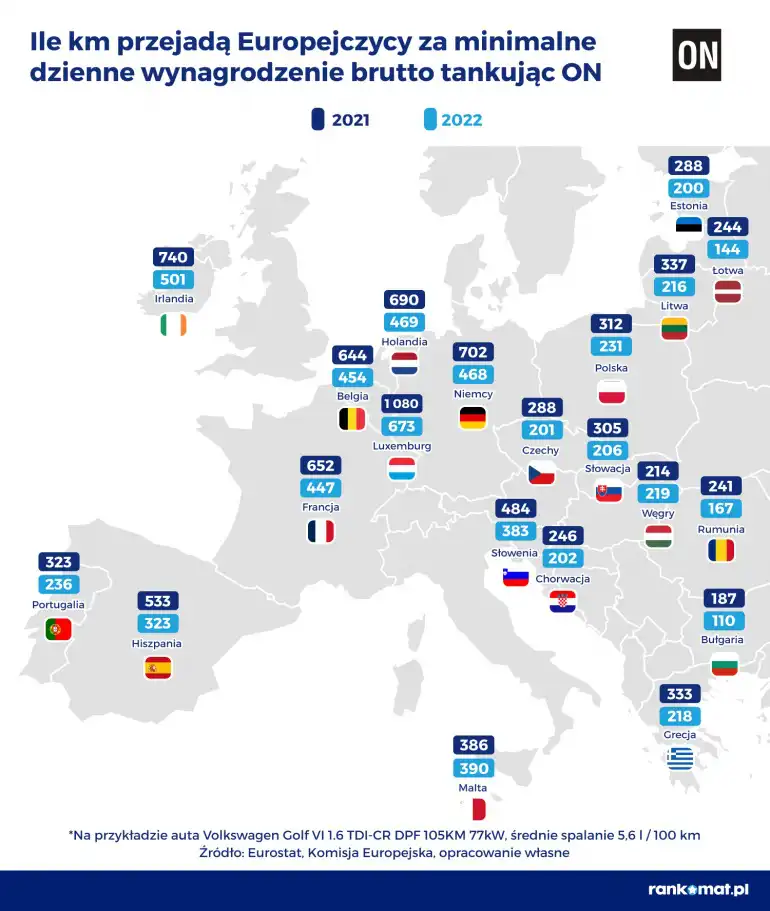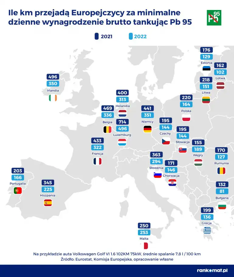 W 2022 roku mieszkaniec Luksemburga może przejechać samochodem ok. 500 km za swoją dzienną pensję, a Polak tylko 160 km. Jeszcze rok temu było to odpowiednio o 218 km i 56 km więcej. Wzrost cen paliw oraz obecna wysokość zarobków spowodowały, że za dzienną pensję niektórzy Europejczycy napełniają bak co najwyżej do 1/5.