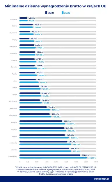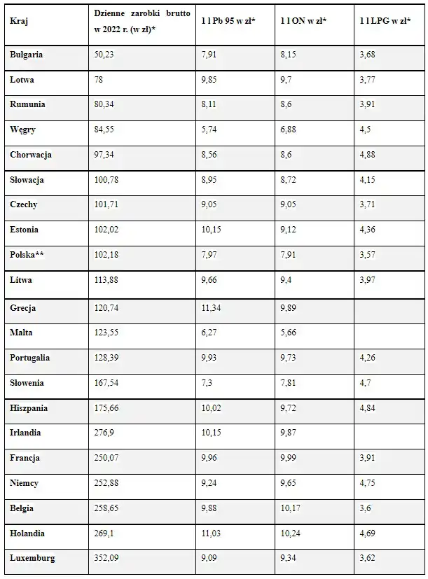 W takim zestawieniu Polska zajmuje 9. miejsce (na 21 państw) pod względem najniższych minimalnych dziennych zarobków brutto. Ratuje nas jednak stosunkowo niska cena benzyny (5. miejsce w UE).