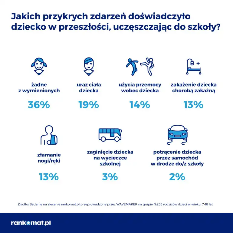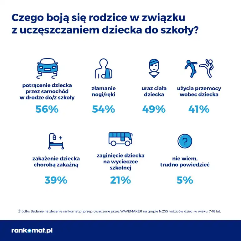 Wyniki badania rankomat.pl pokazują, że rodzice wskazują na wiele różnych obaw jednocześnie. Największy lęk (56 proc. ankietowanych) wiąże się z wyjściem do oraz powrotem ze szkoły, a dokładnie potrącenia dziecka przez samochód. Dla rodziców dużą obawę stanowi również złamanie nogi lub ręki dziecka – wskazuje na to 54 proc. osób. Ogólnego urazu ciała, który wymagałby zszycia rany lub opatrunku boi się nieco mniej osób – 49 proc. Z urazów wymieniane są również zwichnięcie oraz skręcenie nogi lub ręki (45 proc.). Sporym powodem do niepokoju jest również obawa przed przemocą skierowaną na dziecko – stanowi 41 proc. odpowiedzi spośród przebadanych rodziców. Kolejną obawą jest choroba zakaźna – 39 proc. oraz zaginięcie dziecka w trakcie wycieczki szkolnej – 21 proc.