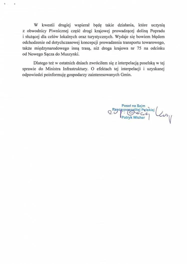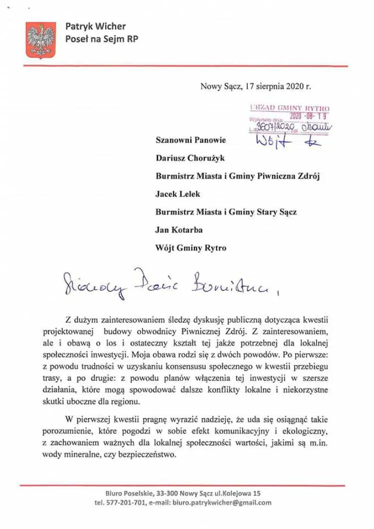 Poseł Patryk Wicher wystosował pismo, do włodarzy gmin zainteresowanych budową obwodnicy w Piwnicznej Zdroju. Poinformował w nim, że planowana inwestycja rodzi jego obawy z dwóch powodów.