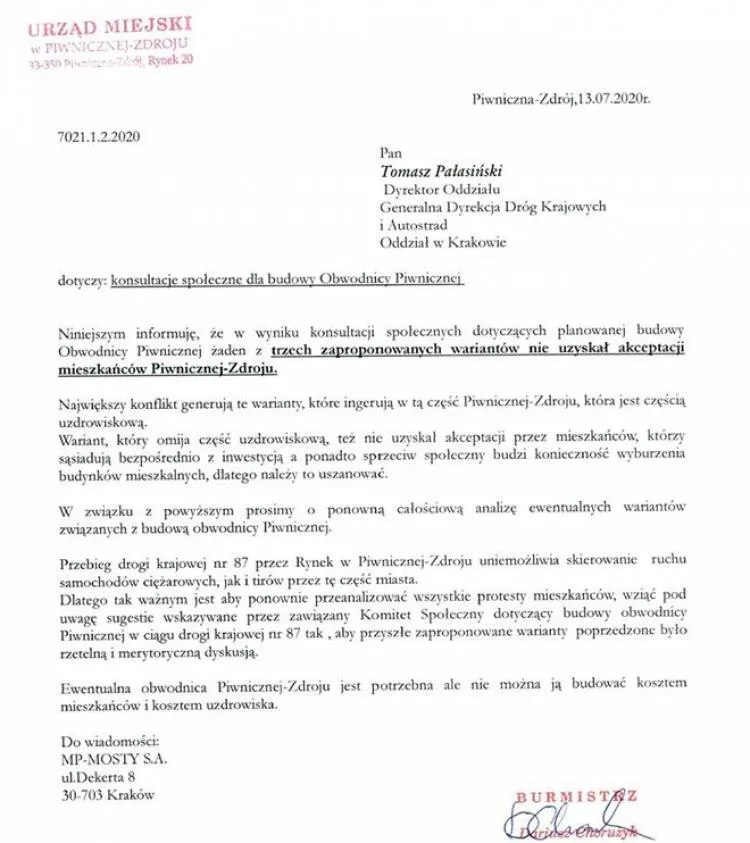 Największy konflikt generują te warianty, które ingerują w tę część Piwnicznej Zdroju, która jest częścią uzdrowiskową. Wariant, który omija część uzdrowiskową, też nie uzyskał akceptacji przez mieszkańców, którzy sąsiadują bezpośrednio z inwestycją, a ponadto sprzeciw społeczny budzi konieczność wyburzenia budynków mieszkalnych, dlatego należy to uszanować. (...) Przebieg drogi krajowej nr 87 przez Rynek w Piwnicznej-Zdroju uniemożliwia skierowanie ruchu samochodów ciężarowych, jak i tirów przez tę część miasta. (...) Ewentualna obwodnica Piwnicznej-Zdroju jest potrzebna, ale nie można jej budować kosztem mieszkańców i uzdrowiska - czytamy w liście burmistrza.