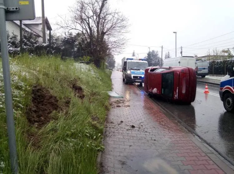 W wyniku zdarzenia przewrócił się na lewy bok i wylądował w pozycji równoległej do chodnika. Z pojazdu wypadła również przednia szyba.