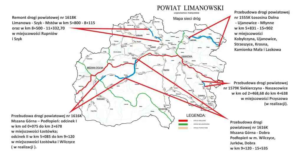 - 5 548 249,00 zł – remont drogi powiatowej nr 1618K Limanowa-Szyk-Mstów na odcinku I w km od 5+800 do km 8+115, na odcinku II w km od 8+500 do km 11+333 w miejscowości Rupinów, Nowe Rybie, Szyk.