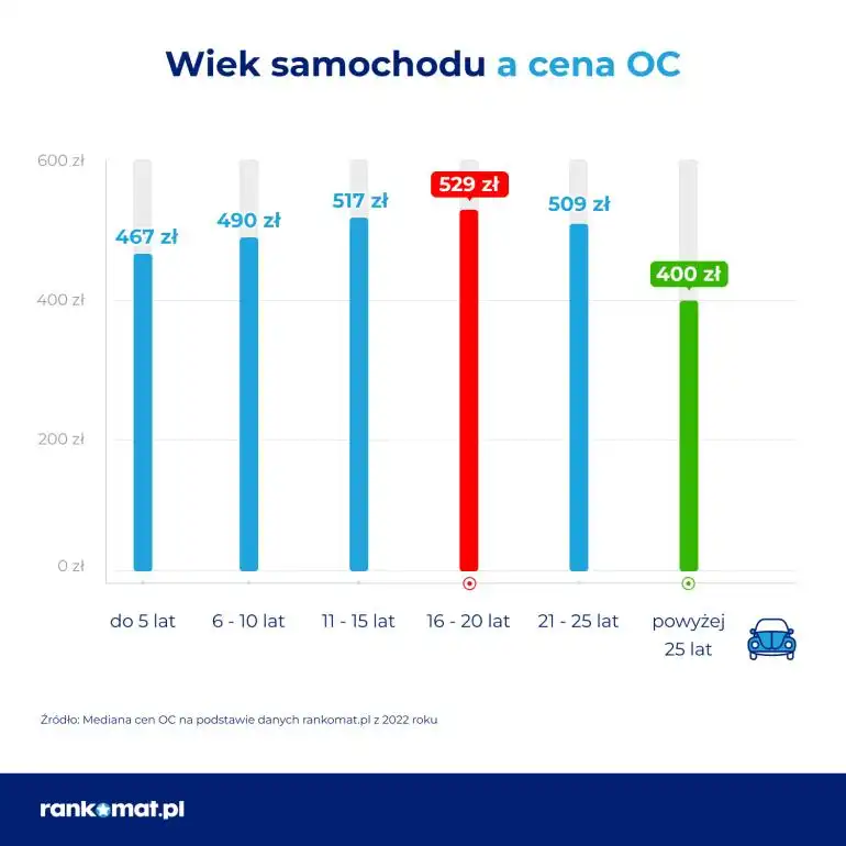 Starszy wiek samochodu obciąża niestety finanse jego właściciela. Za OC kilkunastoletniego auta trzeba z reguły zapłacić najwyższą składkę. W 2022 roku obowiązkowe ubezpieczenie auta w wieku 16-20 lat kosztowało średnio 529 złotych podczas gdy za ubezpieczenie samochodu do 5 lat kierowcy płacili o 12% mniej (467 zł). Ceny polis obniżały się dopiero w przypadku pojazdów najstarszych – mówi Stefania Stuglik, ekspertka ds. ubezpieczeń komunikacyjnych rankomat.pl.