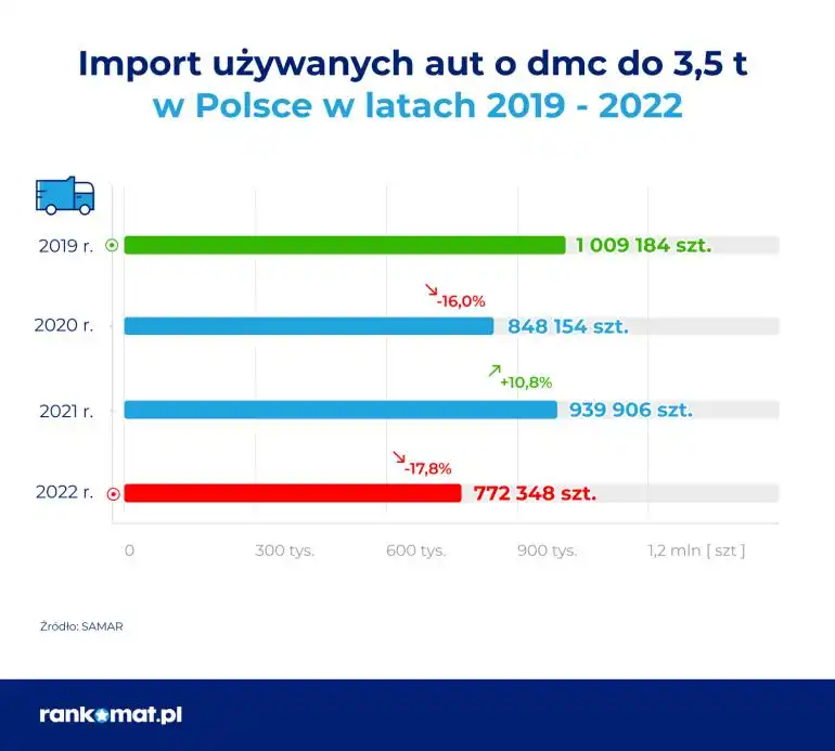 W ubiegłym roku na polski rynek trafiały głównie kilkunastoletnie samochody używane. Na koniec 2022 r. SAMAR poinformował, że średni wiek sprowadzonego z zagranicy auta osiągnął 13,1 lat. Wpływ na to miał rekordowy wiek samochodów osobowych (13,2 lat). Dla pojazdów z silnikiem benzynowych przekroczył on nawet 14 lat (14,06). Z kolei import wszystkich aut używanych (o dmc do 3,5 t) wyniósł w 2022 roku 772, 3 tys. sztuk. Oznaczało to spadek w stosunku do 2021 roku o 17,8%. Niższą liczbę importowanych aut odnotowano 9 lat wcześniej - w 2013 roku (759 455 szt.).