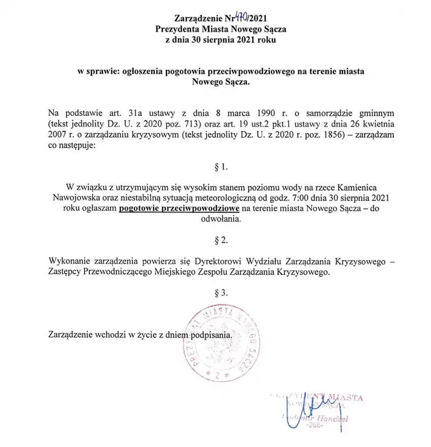 W związku z utrzymującym się wysokim stanem poziomu wody na rzece Kamienica Nawojowska oraz niestabilną sytuację meteorologiczną od godz. 7:00 dnia 30 sierpnia 2021 roku prezydent Ludomir Handzel ogłosił pogotowie przeciwpowodziowe na terenie Miasta Nowego Sącza - do odwołania.