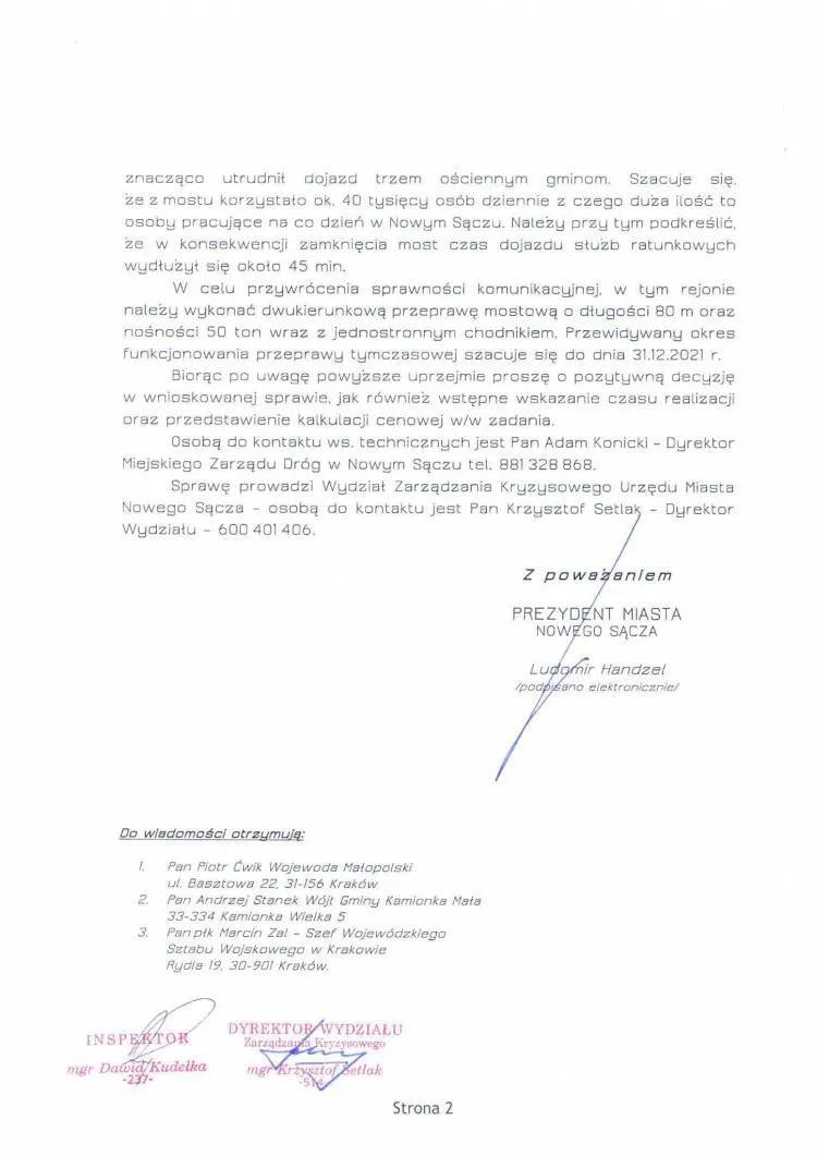 Prezydent wystapił również z wnioskiem do Ministra Klimatu Michała Kurtyki o uruchomienie rezerw strategicznych do wsparcia miasta Nowego Sącza w zaistniałej sytuacji kryzysowej oraz wystosował prośbę do Prezesa Rady Ministrów Mateusza Morawieckiego o udzielenie pomocy w sfinansowaniu tymczasowego mostu na ul. Kamiennej w Nowym Sączu.