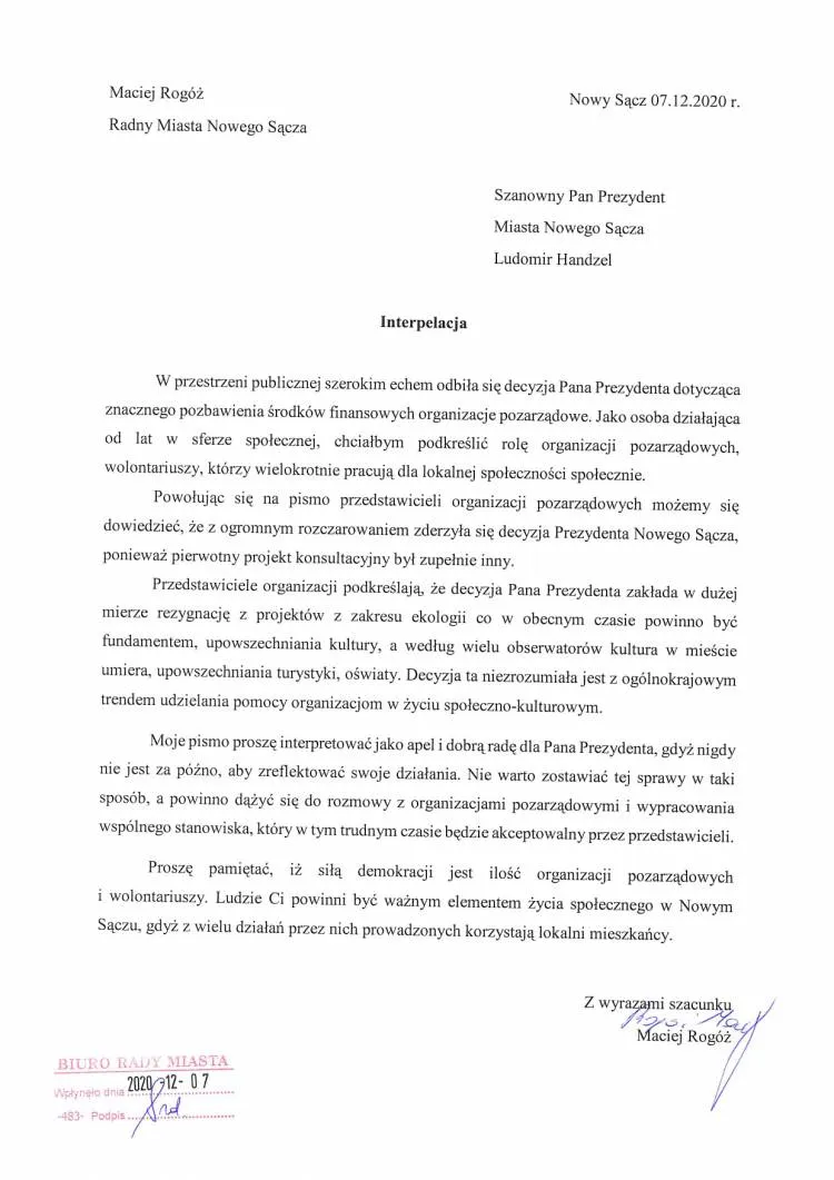 Radny Maciej Rogóż wystąpił do prezydenta Ludomira Handzla z interpelacją odnośnie zmniejszenia puli środków finansowych dla organizacji pozarządowych do których trafi 141 tys. zł mniej niż w roku ubiegłym. Zabrakło środków na zadania z zakresu ekologii, kultury, turystyki, zarządzania kryzysowego, oświaty i wychowania oraz ochrony zdrowia.
