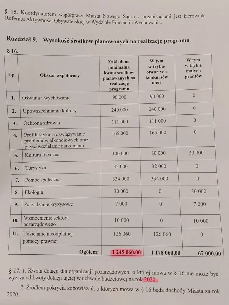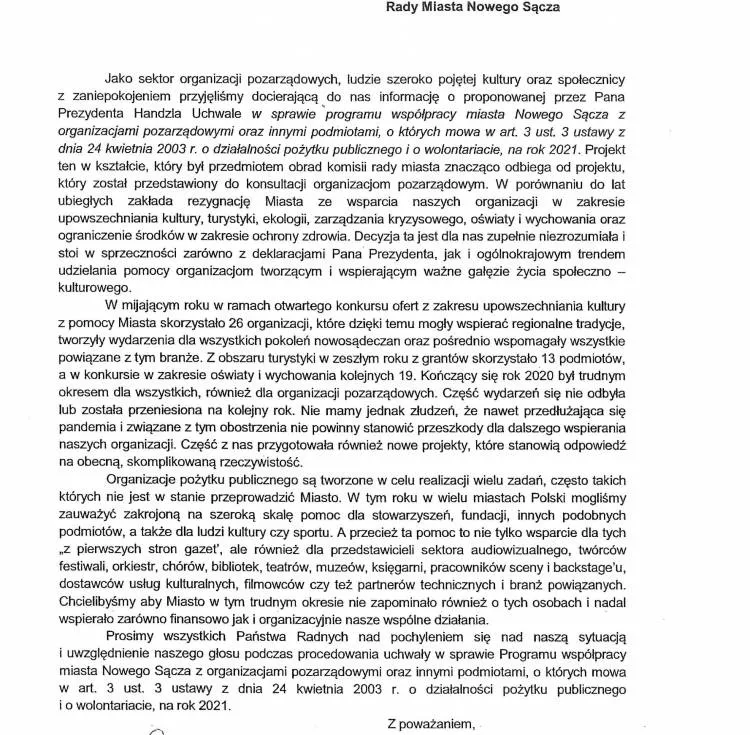 Proponowany przez prezydenta projekt Uchwały w sprawie programu współpracy miasta Nowego Sącza z organizacjami pozarządowymi, który był przedmiotem obrad komisji Rady Miasta znacząco odbiega od projektu, który został przedstawiony do konsultacji organizacjom pozarządowym.