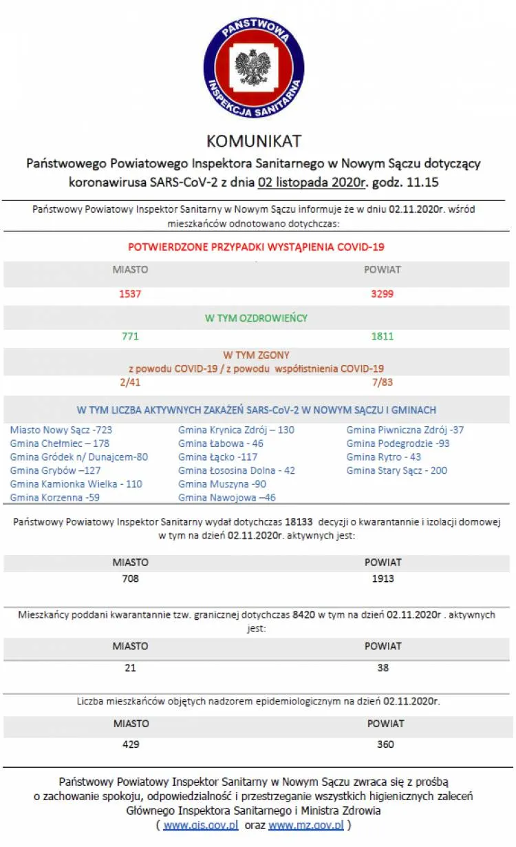 Ostatnie badania laboratoryjne potwierdziły zakażenie koronawirusem SARS-CoV-2 u kolejnych 1749 osób, z Krakowa (584 osoby), powiatu nowosądeckiego (184 osoby), krakowskiego (103 osoby), nowotarskiego (84 osoby), limanowskiego (83 osoby), Nowego Sącza (76 osób), powiatu chrzanowskiego (71 osób), suskiego (70 osób), gorlickiego i myślenickiego (po 66 osób), proszowickiego (57 osób), Tarnowa (48 osób), powiatu tarnowskiego (44 osoby), olkuskiego (40 osób), wielickiego (39 osób), wadowickiego (36 osób), tatrzańskiego (31 osób), miechowskiego (24 osoby), oświęcimskiego (15 osób), bocheńskiego (14 osób), dąbrowskiego (8 osób) oraz powiatu brzeskiego (6 osób). Aktualnie 52 osoby są hospitalizowane, pozostałe przebywają w izolacji. Obecnie w Małopolsce zakażenie koronawirusem zostało potwierdzone u 46 464 osób.