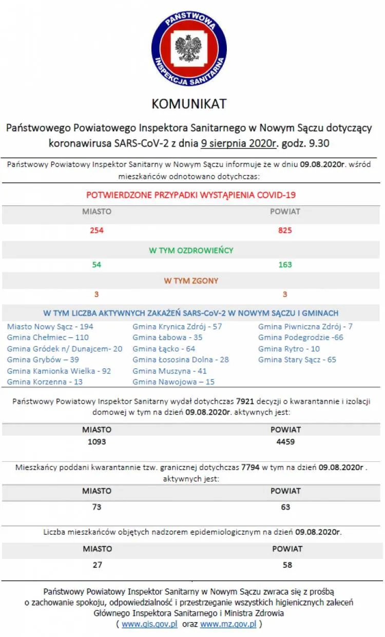 Dzisiaj na terenie powiatu nowosądeckiego odnotowano 21 kolejnych zakażeń wirusem SARS-CoV-2, a w mieście Nowy Sącz 3. Z kolei w regionie, w powiecie limanowskim jest 6 nowych zachorowań, a w powiecie gorlickim 5. Pojawiła się także 2 ozdrowieńców.