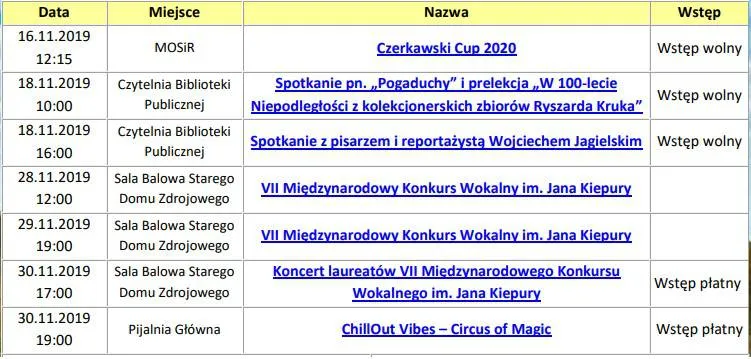W dniach 28 .11-30.11.2019, w Sali Balowej Starego Domu Zdrojowego odbędzie się VII Międzynarodowy Konkurs Wokalny im. Jana Kiepury, który zakończy się Koncertem Laureatów (Wstęp płatny).