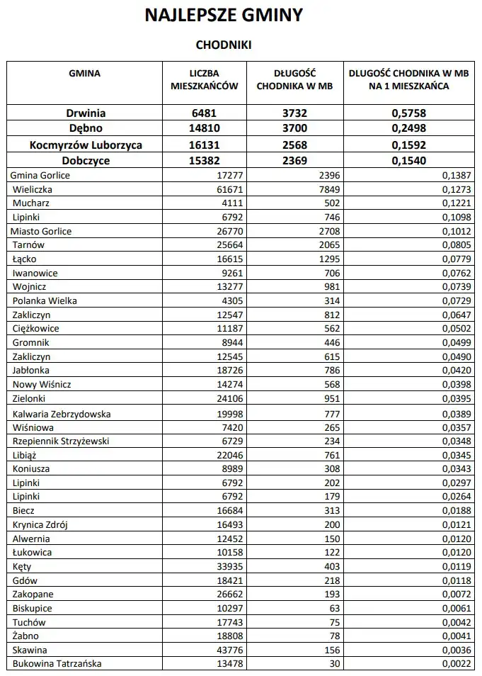 DRWINIA za wybudowanie 0,57 mb chodników na 1 mieszkańca gminy,