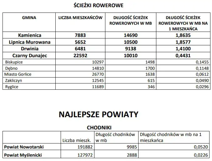 POWIAT MYŚLENICKI za wybudowanie 2.888 mb chodników (0,022 mb chodników na 1 mieszkańca powiatu) oraz 1.214 mb ścieżek rowerowych