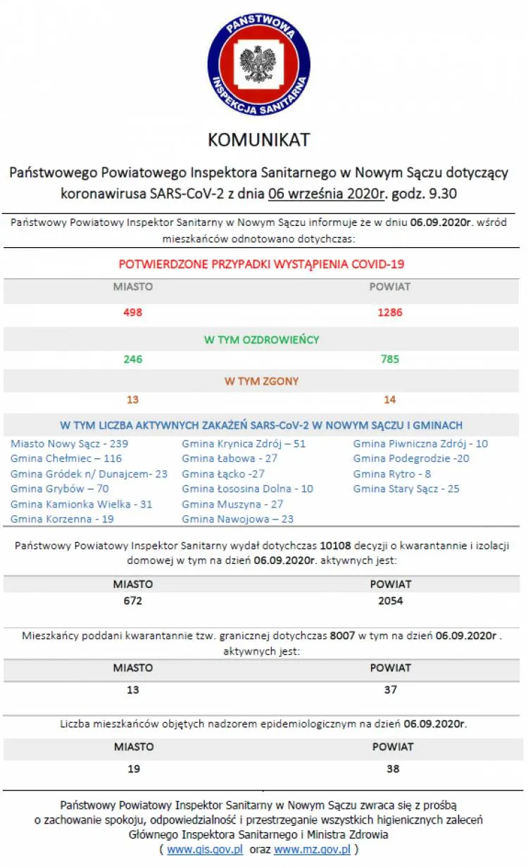 Dzisiaj na terenie powiatu nowosądeckiego odnotowano tylko 6 kolejnych zakażeń wirusem SARS-CoV-2, a w mieście Nowy Sącz 1. Na Sądecczyźnie pojawiło się również 11 nowych ozdrowieńców.