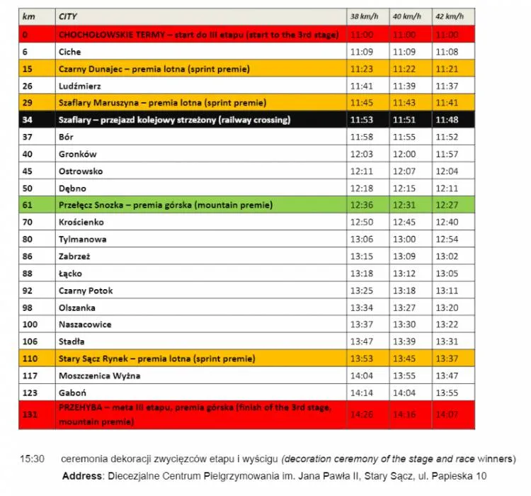 Trasa trzeciego etapu prowadzić będzie tak jak w latach ubiegłych z Chochołowa (Chochołowskie Termy) na Przehybę. Peleton przejedzie przez Stary Sącz, Moszczenicę Wyżną, Przysietnicę, Skrudzinę i Gaboń. Dekoracja zwycięzców odbędzie się w Starym Sączu.