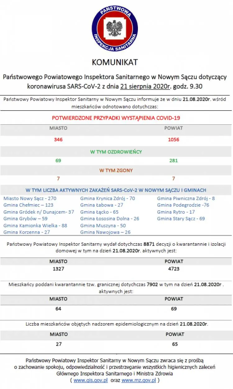 Dzisiaj na terenie powiatu nowosądeckiego odnotowano 8 kolejnych zakażeń wirusem SARS-CoV-2, a w mieście Nowy Sącz 4. Na Sądecczyźnie pojawiło się również 10 nowych ozdrowieńców. Niestety są też trzy kolejne ofiary śmiertelne wirusa, wśród których jest 83-letni mieszkaniec powiatu nowosądeckiego. Z kolei w regionie, w powiecie limanowskim jest 10 nowych zachorowań, a w powiecie gorlickim 2. Pojawiło się także 8 ozdrowieńców.