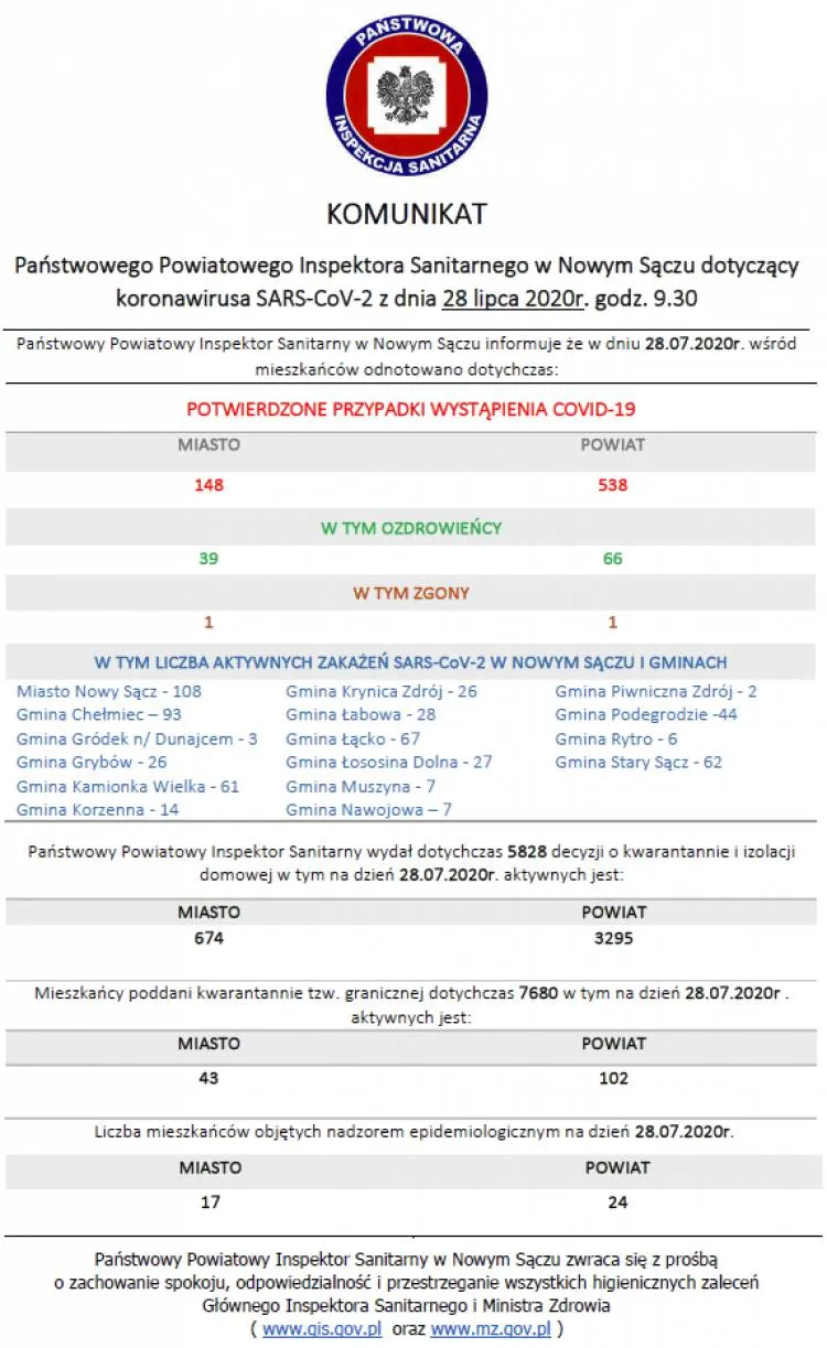 Ostatnie badania laboratoryjne potwierdziły zakażenie koronawirusem SARS-CoV-2 u kolejnych 91 osób. To 37 kobiet i 54 mężczyzn, w wieku od 2 do 84 lat, z powiatu nowosądeckiego (20 osób), tatrzańskiego (18 osób), oświęcimskiego (14 osób), myślenickiego (7 osób), nowotarskiego (6 osób), Krakowa (5 osób), Nowego Sącza i powiatów: gorlickiego i tarnowskiego (po 3 osoby), dąbrowskiego, suskiego, limanowskiego, wadowickiego (po 2 osoby) oraz Tarnowa i powiatów: brzeskiego, krakowskiego i wielickiego (po 1 osobie). Aktualnie 2 osoby są hospitalizowane, pozostałe przebywają w izolacji. Obecnie w Małopolsce zakażenie koronawirusem zostało potwierdzone u 3223 osób.