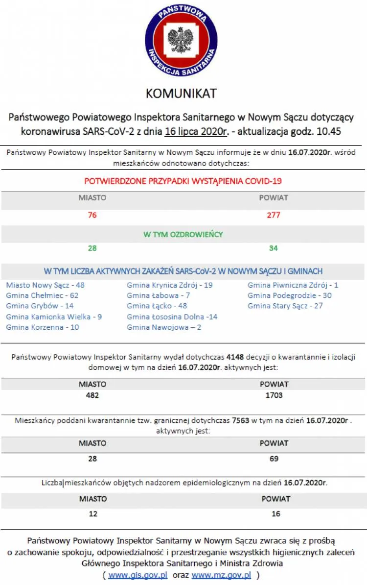 Państwowy Powiatowy Inspektor Sanitarny w Nowym Sączu wydał komunikat, w którym informuje o zakażeniach koronawirusem na terenie Sądecczyzny w rozbiciu na miasto Nowy Sącz i Gminy z terenu powiatu nowosądeckiego.