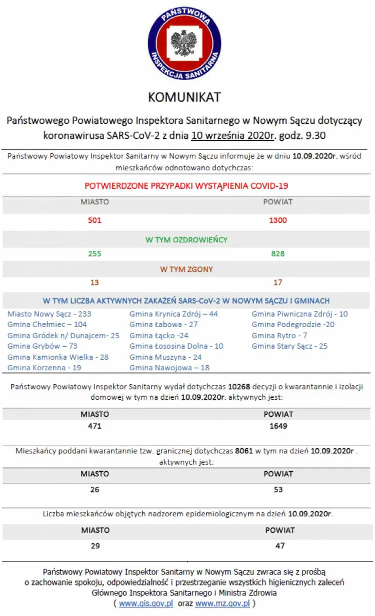 Dzisiaj na terenie powiatu nowosądeckiego i miasta Nowy Sącz odnotowano w sumie tylko 2 kolejne zakażenia wirusem SARS-CoV-2. Na Sądecczyźnie pojawiło się również 22 nowych ozdrowieńców. Z kolei w regionie, w powiecie limanowskim jest 8 nowych zachorowań, a w powiecie gorlickim 1. Pojawiło się także 10 ozdrowieńców.