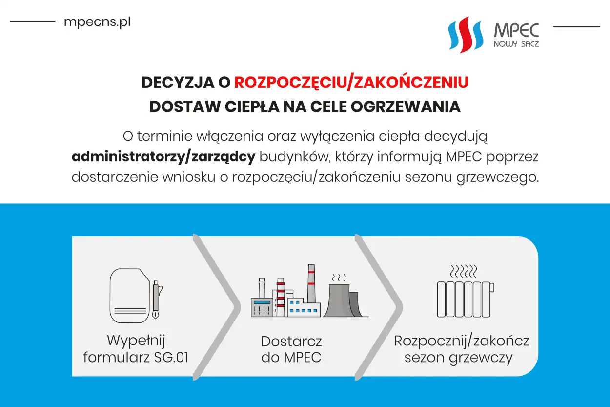 Każdego roku MPEC Nowy Sącz przypomina, że o terminie włączenia ciepła decydują administratorzy budynków. Dlatego jeśli mieszkańcy oczekują konkretnego terminu włączenia ciepła, wystarczy skontaktować się z administratorem lub zarządcą, a ten poinformuje spółkę MPEC.