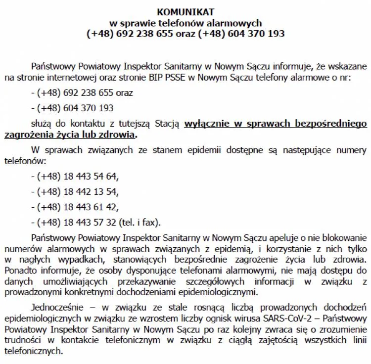 Państwowy Powiatowy Inspektor Sanitarny w Nowym Sączu apeluje o nie blokowanie numerów alarmowych w sprawach związanych z epidemią, i korzystanie z nich tylko w nagłych wypadkach, stanowiących bezpośrednie zagrożenie życia lub zdrowia.