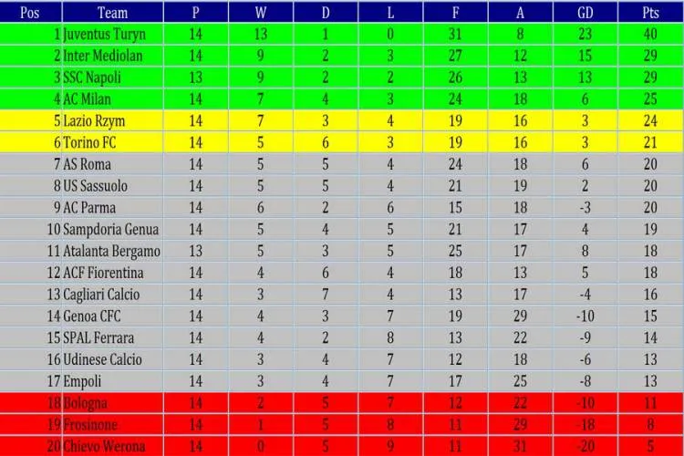 W Serie A Fiorentina była bezradna w meczu z Juventusem i po pół godzinie gry straciła pierwszego gola, w drugiej połowie meczu Stara dama dołożyła jeszcze dwa gole i wygrała we Florencji 3 -0. Wicelider Inter zremisował w Rzymie z AS ROMA 2 - 2 ,w Mediolanie AC Milan pokonał Parme 2 - 1 .