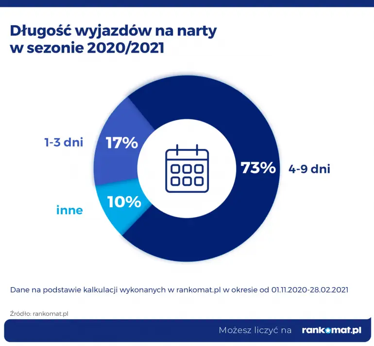 Pandemia sprawiła, że najchętniej wybieraliśmy się na wyjazdy kilkudniowe. 73% narciarzy zdecydowało się na urlop zimowy od 4 do 9 dni. Krótkie wyjazdy (od 1 do 3 dni) zaplanowało jedynie 17% z nich. Tylko 10% narciarzy zdecydowało się na dłuższe podróże.