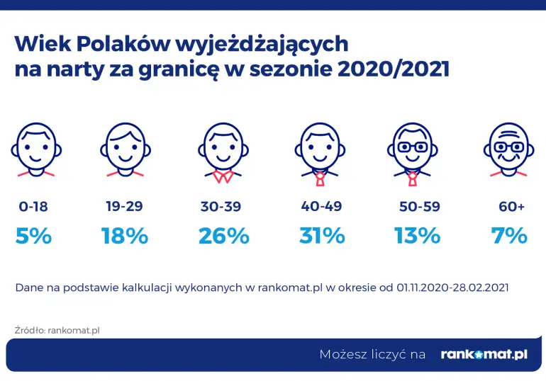 Najchętniej na zagraniczne stoki wybierali się narciarze z grupy wiekowej 40-49 lat - to aż 31% wszystkich osób deklarujących wyjazdy zimowe. Nieco mniej licznie reprezentowani byli trzydziestolatkowie (26%) oraz dwudziestolatkowie (18%). W tegorocznym sezonie szusowało także 13% osób w przedziale wiekowym 50-59 lat. Najrzadziej na narty wyjeżdżały dzieci i młodzieży do 18 roku życia (5%) oraz seniorzy 60+ (7%).