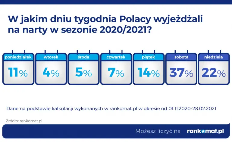 Narciarze przedłużali zimowe wyjazdy, decydując się na rozpoczęcie podróży od soboty (37%) lub niedzieli (22%). 14% miłośników jazdy na nartach wyjeżdżało w piątek. Najrzadziej wyjeżdżano we wtorki (4%) i środy (5%).