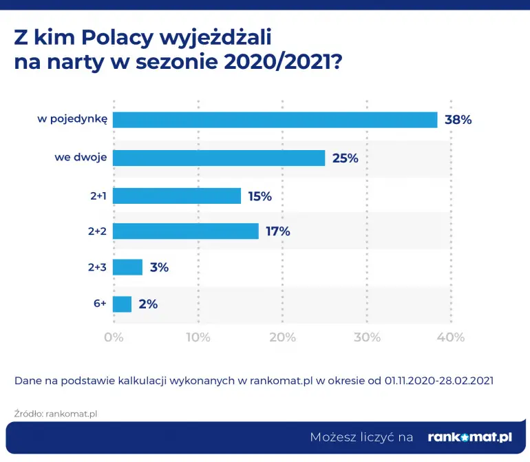 Tak jak każdego roku najwięcej wyjazdów deklarowanych było jako wyjazd w pojedynkę - to aż 38% wszystkich kalkulacji. 25% narciarzy zamierzało wyjechać na narty z drugą osobą. Sporo osób wyjeżdżających w większych grupach – łącznie aż 35% zadeklarowało podróż w konfiguracji 2 + jedna, dwie lub trzy osoby towarzyszące. Tylko 2% kalkulacji dotyczyła wyjazdów dla grupy większej niż 6 osób.