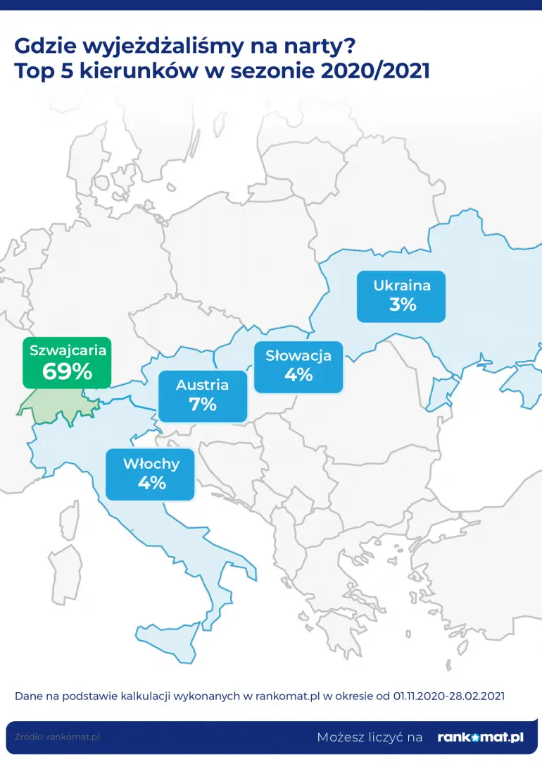 Przez długi czas narciarze nie mogli planować zimowego odpoczynku w Polsce. Także wiele innych państw w Europie zamknęło swoje stoki. Jedyną możliwością był wyjazd do Szwajcarii - i to potwierdzają dane. Aż 69% amatorów zagranicznego narciarstwa, jako kierunek wyjazdu wskazało właśnie ten alpejski kraj. Na drugim miejscu znalazła się Austria, mając jedynie 7% wskazań. Włochy i Słowację wybrało po 4% narciarzy. W top 5 znalazła się także Ukraina, gdzie na narty zdecydowało się 3% osób. Ten ostatni kraj również dawał możliwość swobodnego szusowania po stokach i wjazdu do kraju przez pewien czas.