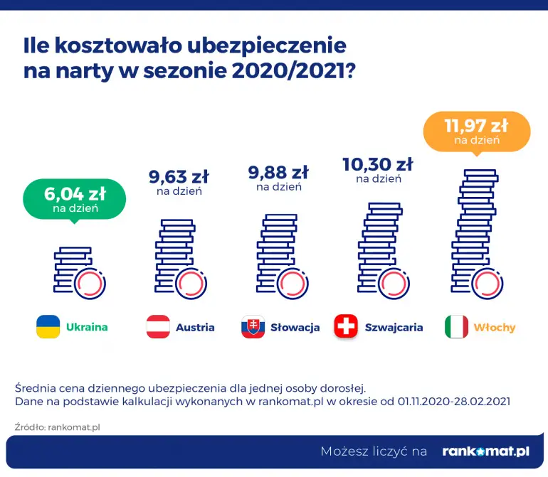 Najmniej za ubezpieczenie na narty płacili szusujący na Ukrainie (6,04 zł/dzień). Najwięcej na zakup polisy przeznaczono na zakup polisy do Włoch (11,9 zł/dzień). Ponad 9 zł płacili wyjeżdżający do Austrii i Słowacji. Nieco ponad 10 zł kosztowało ubezpieczenie do Szwajcarii.
