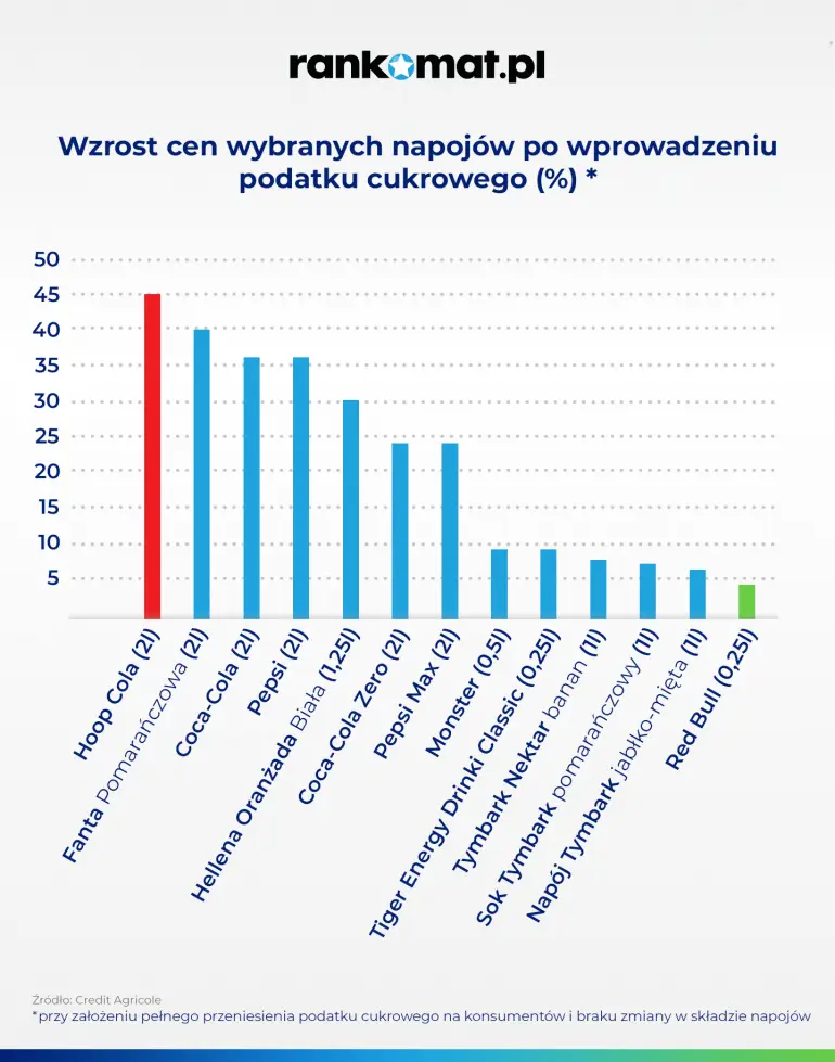 Najwyższy, około 45% wzrost ceny, dotknąłby wielbicieli Hoop Coli w dwulitrowej butelce. Na kolejnych miejscach znalazłby się Fanta Pomarańczowa (ok. 40% wzrost) oraz Coca-Cola i Pepsi (ok. 36% wzrost). Mając jednak na uwadze potencjalny spadek popytu producenci prawdopodobnie będą zmniejszać swoje marże i szukać innych sposobów na ograniczenie skali podwyżek.