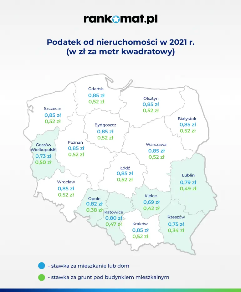 Aż 10 miast wojewódzkich (Warszawa, Gdańsk, Kraków, Wrocław, Poznań, Łódź, Białystok, Olsztyn, Bydgoszcz, Szczecin) zdecydowało się na wprowadzenie maksymalnych stawek proponowanych przez Ministerstwo Finansów. Najniższe podatki od nieruchomości mieszkalnych i gruntów obowiązują w Zielonej Górze i są one niemal o połowę niższe od stawek maksymalnych (0,44 zł za dom lub mieszkanie i 0,28 zł za grunt pod budynkiem mieszkalnym).