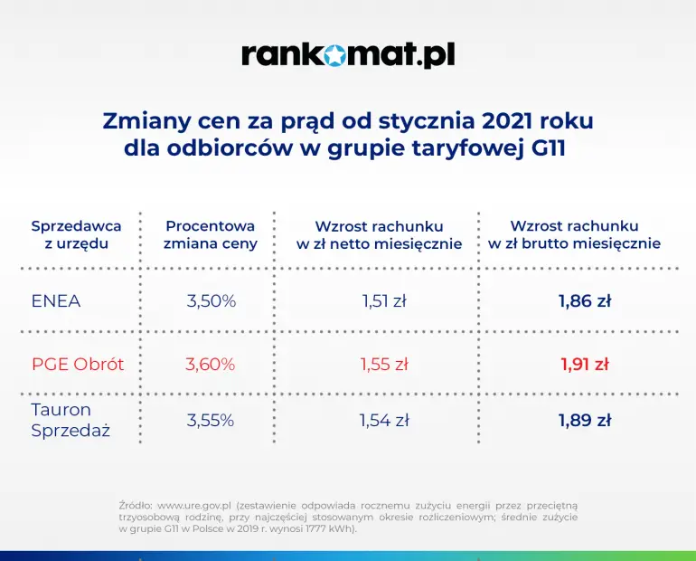 - wzrost cen dla odbiorców w taryfie G11 o 1,89 zł brutto miesięcznie (około 22,68 zł rocznie),