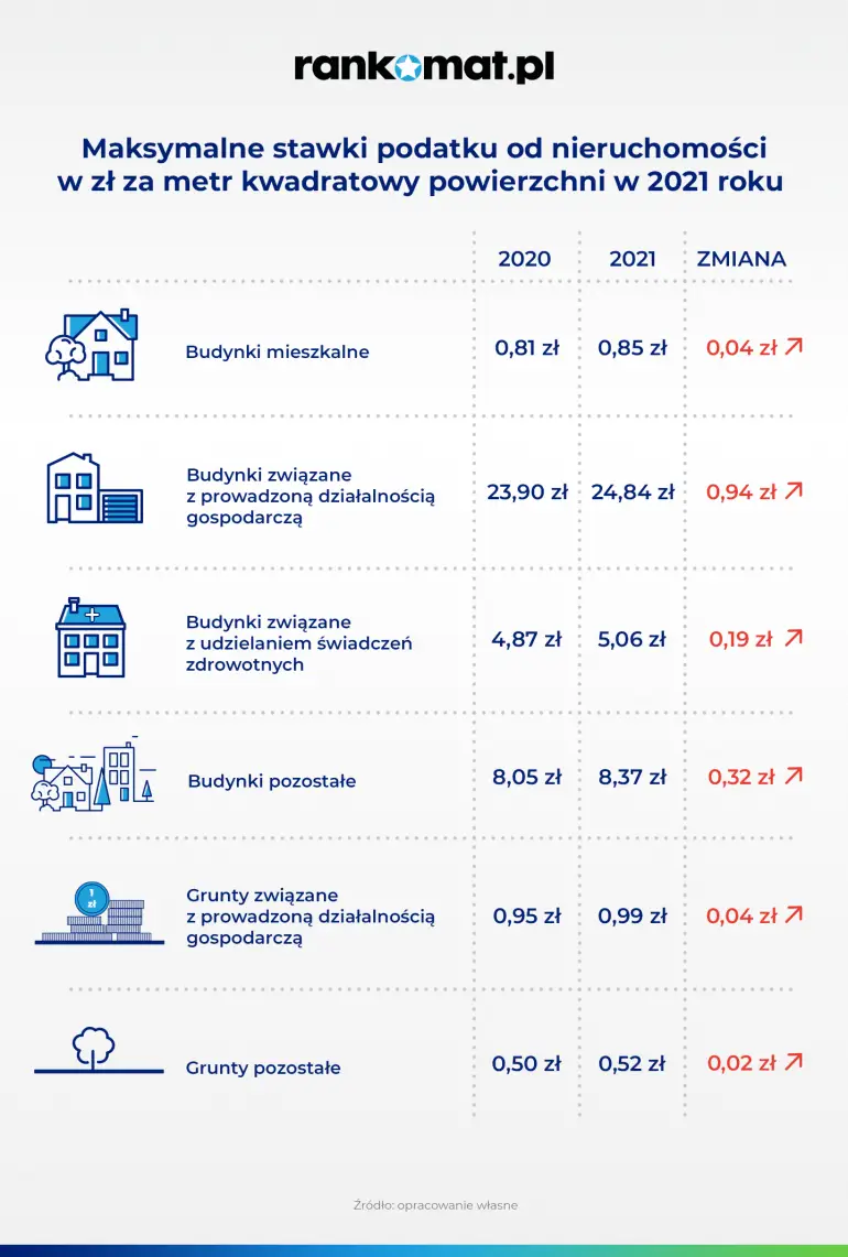 Właściciele nieruchomości mieszkalnych mogą zostać obciążeni maksymalnym podatkiem wynoszącym 85 gr za metr kwadratowy. Przedsiębiorcy mogą zapłacić nawet 24,84 za metr kwadratowy, co stanowi wzrost o 94 gr w stosunku do 2020 roku. Skalę podwyżek w 2021 r. dla wybranych rodzajów nieruchomości prezentuje poniższa tabela.