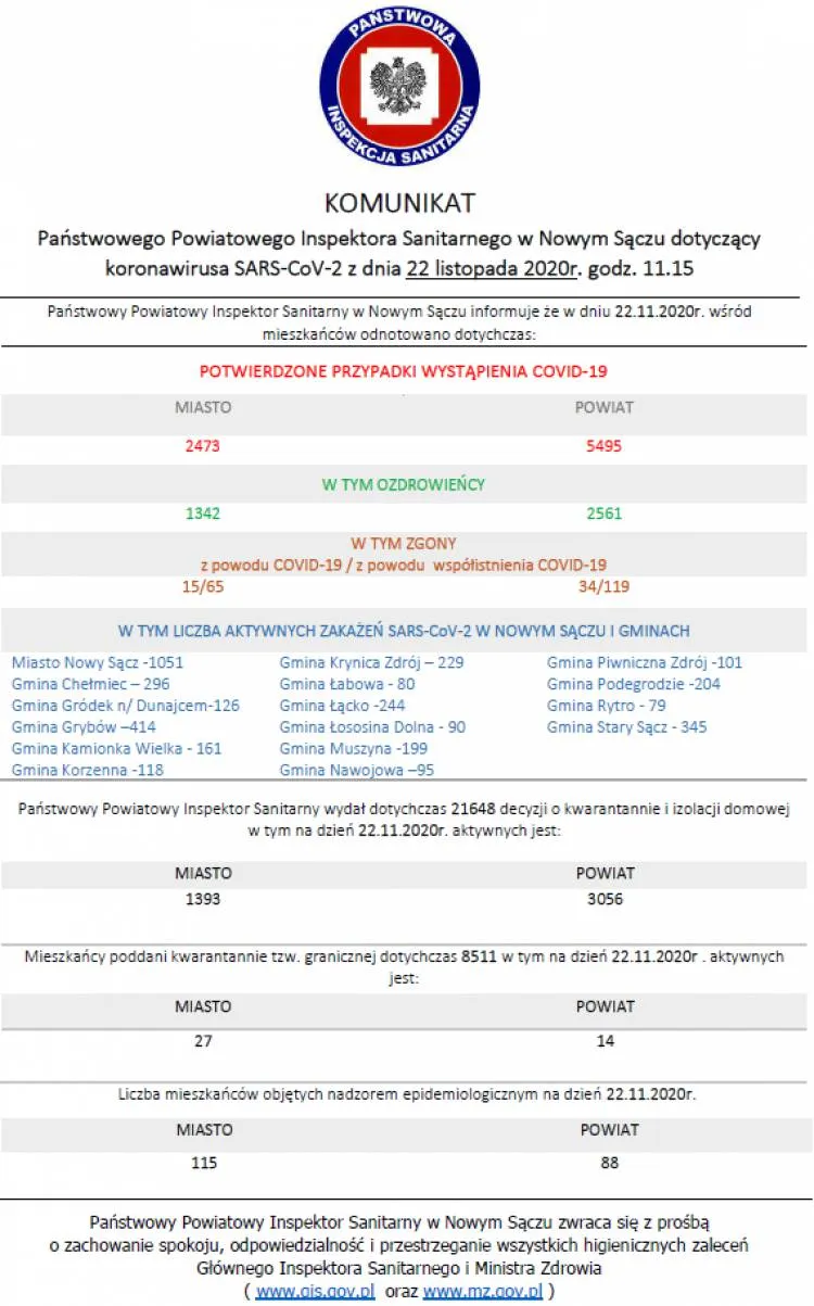 Dzisiaj na terenie powiatu nowosądeckiego odnotowano 55 kolejnych zakażeń wirusem SARS-CoV-2, a w mieście Nowy Sącz 20. Na Sądecczyźnie pojawiło się również 109 kolejnych ozdrowieńców. Z kolei w regionie, w powiecie limanowskim są 23 nowe zachorowania, a w powiecie gorlickim 23.