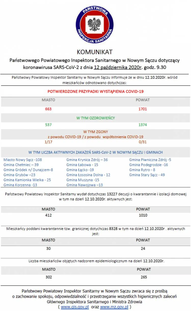 Dzisiaj na terenie powiatu nowosądeckiego odnotowano 28 kolejnych zakażeń wirusem SARS-CoV-2, a w mieście Nowy Sącz 5. Na Sądecczyźnie pojawiło się również 8 nowych ozdrowieńców. Z kolei w regionie, w powiecie limanowskim jest 19 nowych zachorowań, a w powiecie gorlickim 26. Pojawiło się także 13 ozdrowieńców.