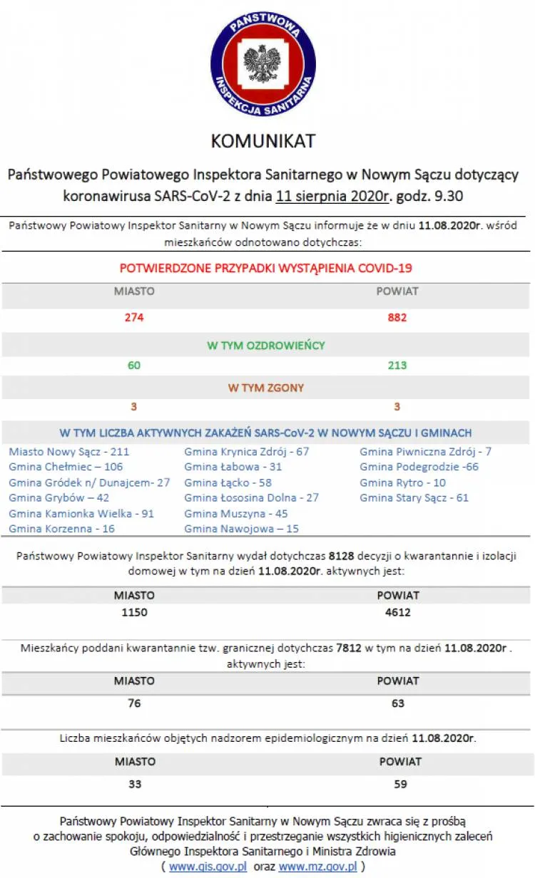 Ostatnie badania laboratoryjne potwierdziły zakażenie koronawirusem SARS-CoV-2 u kolejnych 71 osób. Ponadto z WSSE w Krakowie została przekazana informacja uzupełniająca dotycząca wczoraj zgłoszonych nowych przypadków, wykrytych w ramach badań przesiewowych prowadzonych w firmach w regionie nowosądeckim. W poniższej charakterystyce osób zakażonych zostały one uwzględnione.