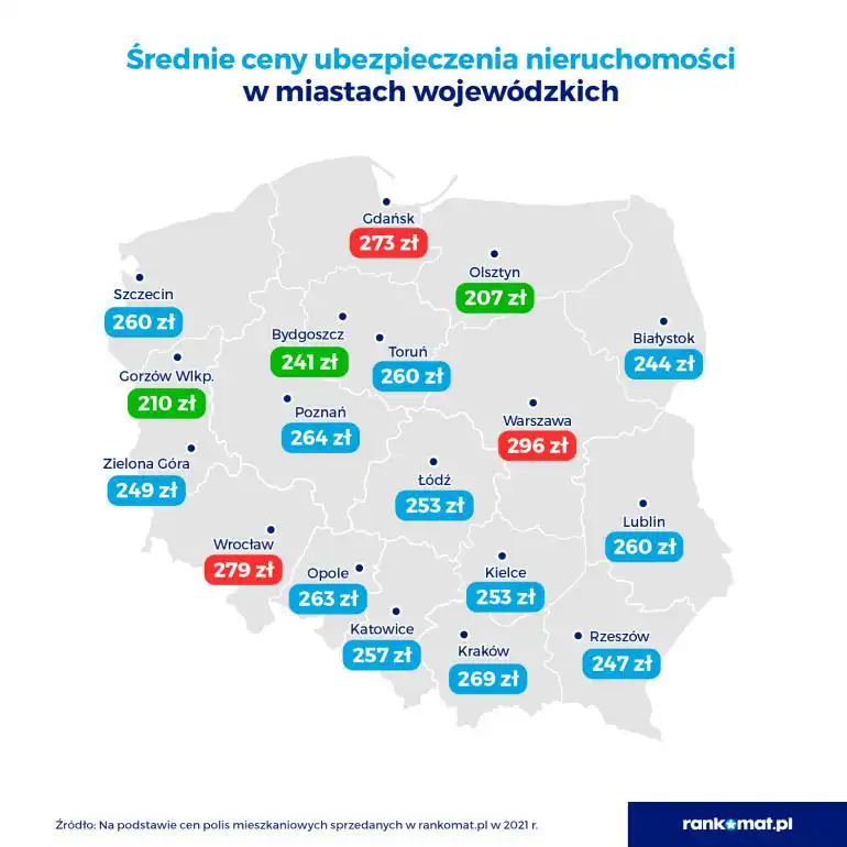 Średnia dla wszystkich miast wojewódzkich za polisę mieszkaniową w 2021 r. wyniosła 255 zł, czyli mniej niż w województwach. Najwięcej na ubezpieczenie nieruchomości wydawali lokatorzy z Warszawy, Wrocławia i Gdańska – prawie 300 zł rocznie. Najmniej – nieco ponad 200 zł rocznie – mieszkańcy Olsztyna i Gorzowa Wlkp. Różnice w cenach polis pokrywają się z różnicami w cenach domów i mieszkań w miastach wojewódzkich.