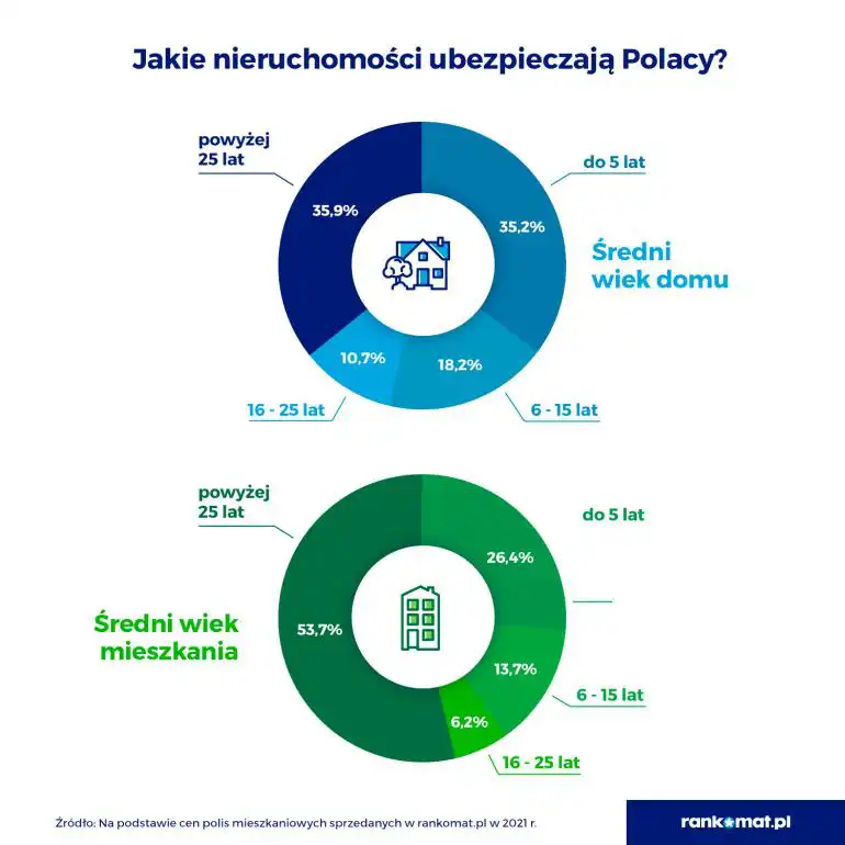 W ostatniej edycji raportu RanKING sprzed dwóch lat większość ubezpieczonych domów była nowa (do 5 lat). Jednak w 2021 r. największą część domów stanowią te wybudowane ponad 25 lat temu (35,9%). Wśród mieszkań najstarsze stanowią aż 53,7% nieruchomości. W 2021 roku domy do 5 lat ubezpieczało 35,2% osób, natomiast mieszkania o tym wieku 26,4%.