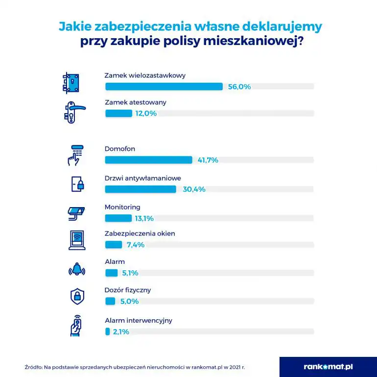 51,9% klientów rankomat.pl wykupiło rozszerzenie chroniące w przypadku kradzieży. Jednocześnie deklarują, że nie posiadają wiele zabezpieczeń przed kradzieżą. Tylko 30,4% chroni swój majątek drzwiami antywłamaniowymi. 56% ma jednak zamek wielozastawkowy, a 12% zamek atestowany. Jedynie garstka ubezpieczających deklaruje posiadanie zabezpieczenia takich jak: monitoring 13,1%, zabezpieczenie okien 7,4%, alarm 5,15%, dozór fizyczny 5%, czy alarm interwencyjny 2,1%. Warto o tym pamiętać, ponieważ w 2021 roku policji zgłoszono 71625 kradzieży z włamaniem. To mniej prawie o 900 niż w ubiegłym roku jednak więcej o kilka tysięcy niż w 2017, 2018 i 2019 roku.