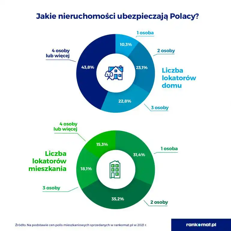 W mieszkaniach, które z reguły są mniejsze od domów, najczęściej mieszka 2 lokatorów (35,2%). Prawie tak samo często nieruchomości ubezpieczają single (31,4%), a tylko 18,1% w konfiguracji 3-osobowej i 15,3% w konfiguracji 4-osobowej.