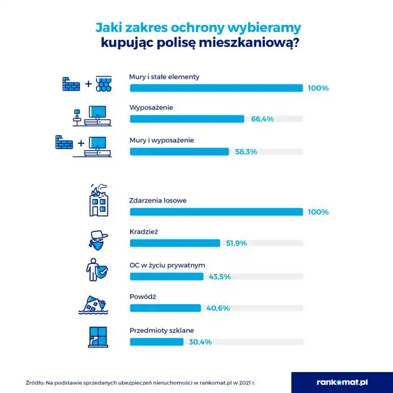 Dla ponad połowy kupujących polisy mieszkaniowe sama podstawa to za mało. Nieco ponad 58% wybiera oprócz murów i stałych elementów także ochronę finansową dla wyposażenia. Samo wyposażenie (66,4% kupujących) przydaje się lokatorom, którzy wynajmują dom lub mieszkanie. Wszyscy ubezpieczają nieruchomość od zdarzeń losowych typu pożar, zalanie, wichura czy uderzenie pojazdu. Jednak mniej niż połowa ubezpieczających decyduje się na polisę na wypadek powodzi (40,6%) i stłuczenia przedmiotów szklanych (30,4%). Dodatkowo 43,5% ubezpieczających wykupiło dodatkowo OC.